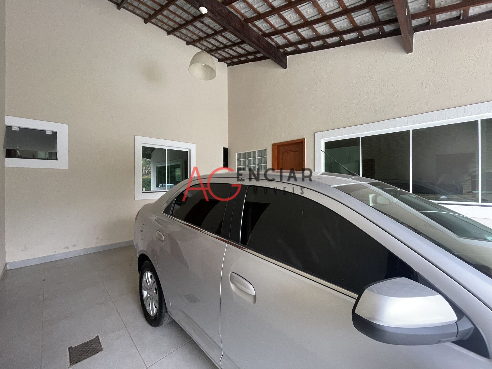 Garagem coberta para dois carros, com espaço para mais quatro carros na área descoberta.