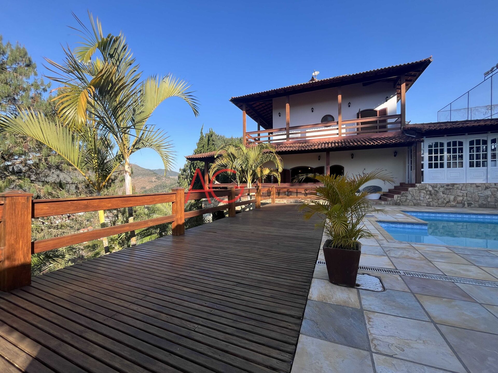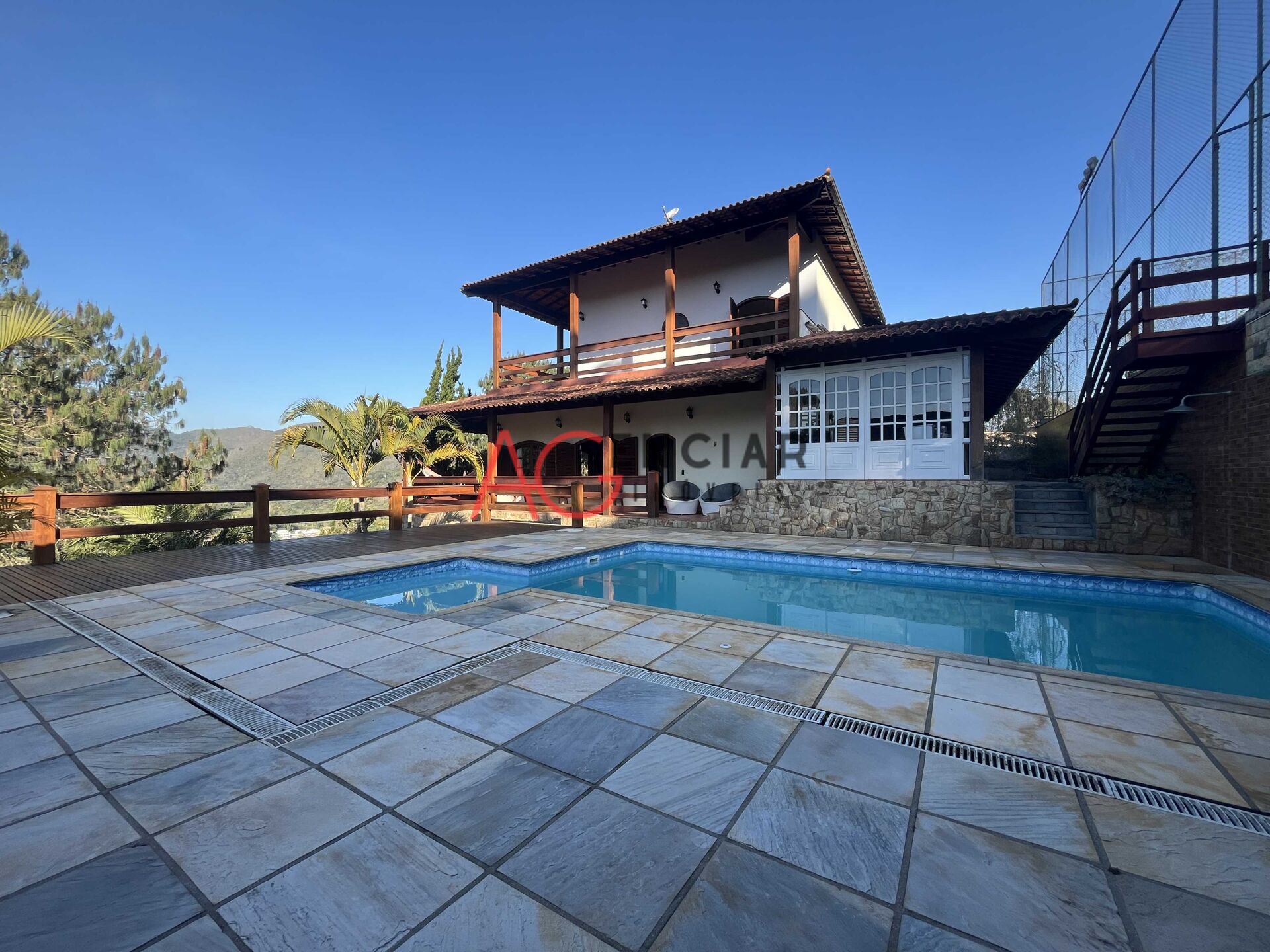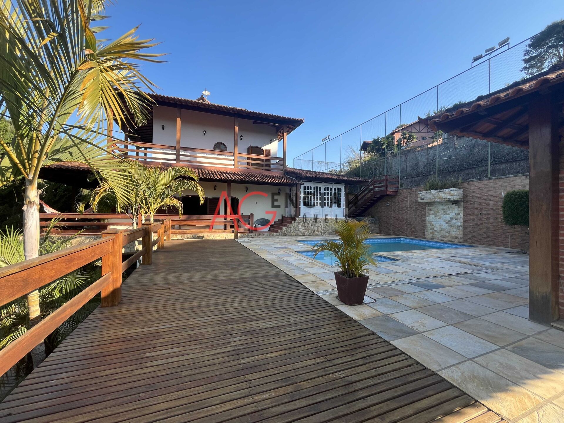 Casa composta com 4 quartos com suítes com saida para varanda , 1 closet, sala em dois ambientes com lareira, cozinha ampla, banheiro social, jardim de inverno, varanda com vista para as montanhas, churrasqueira, piscina, dependecia para empregada, canil para cães de grande porte, campo de futebol e garagem para 5 carros.