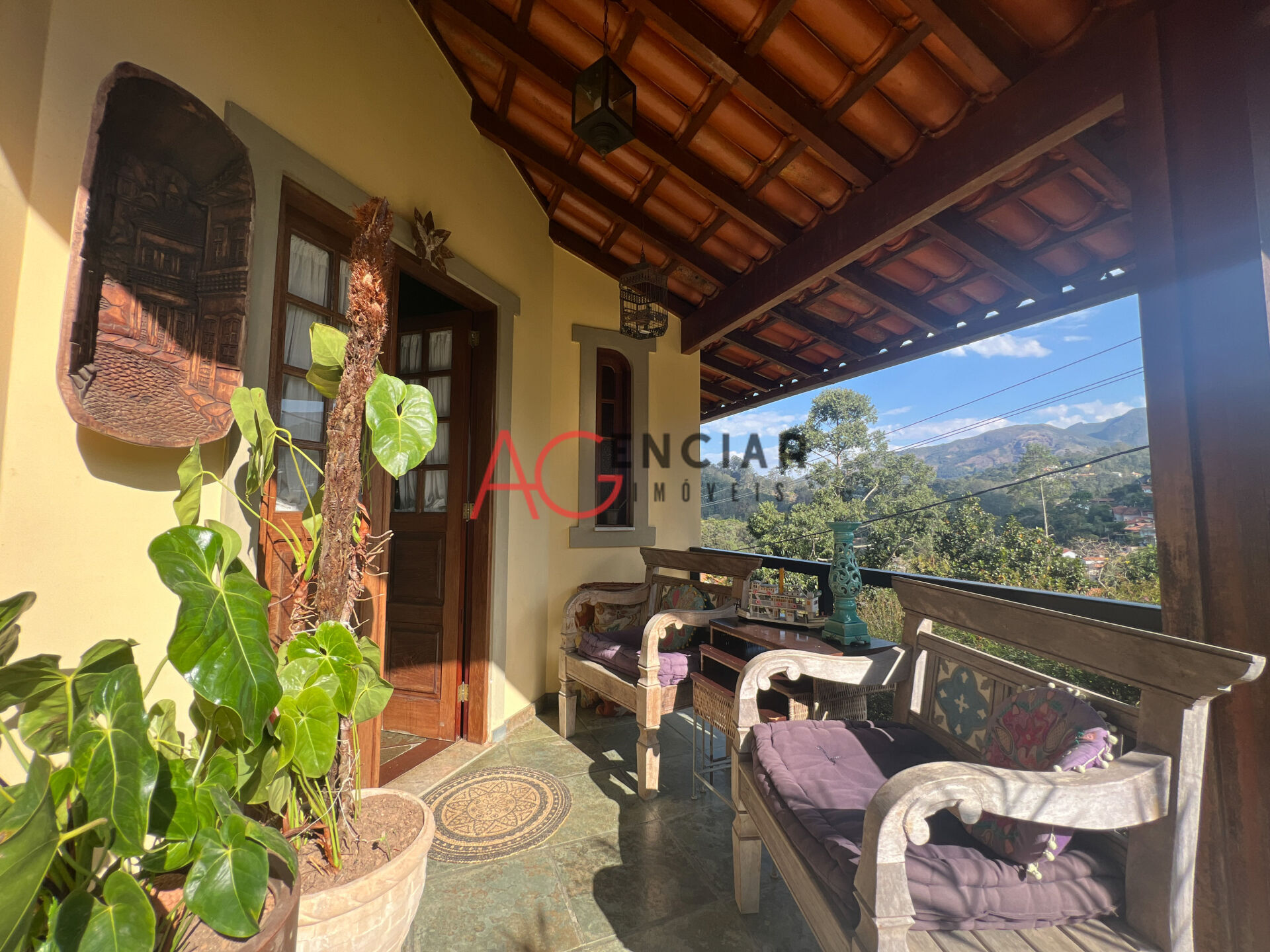Varanda aconchegante, e espaço com gramado tendo uma linda vista para as montanhas.